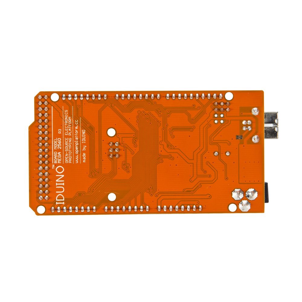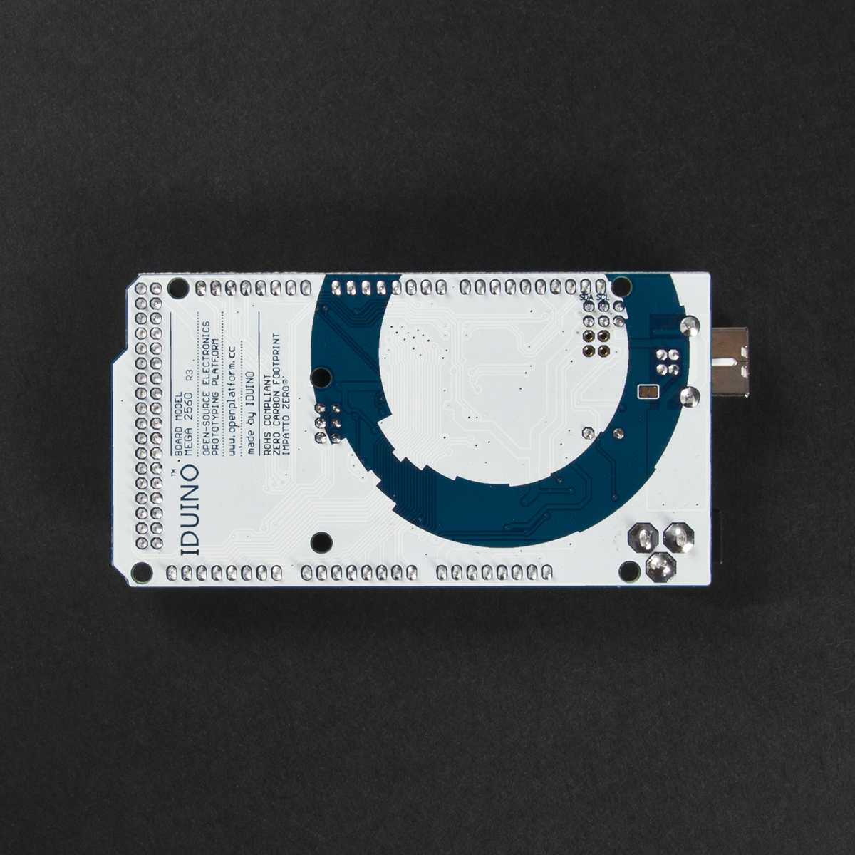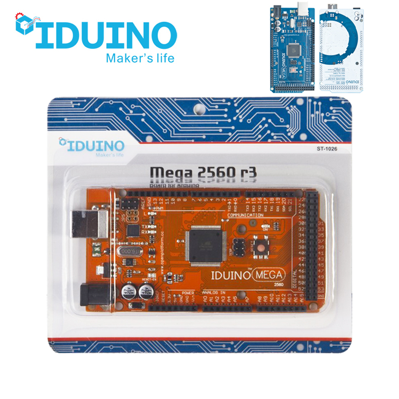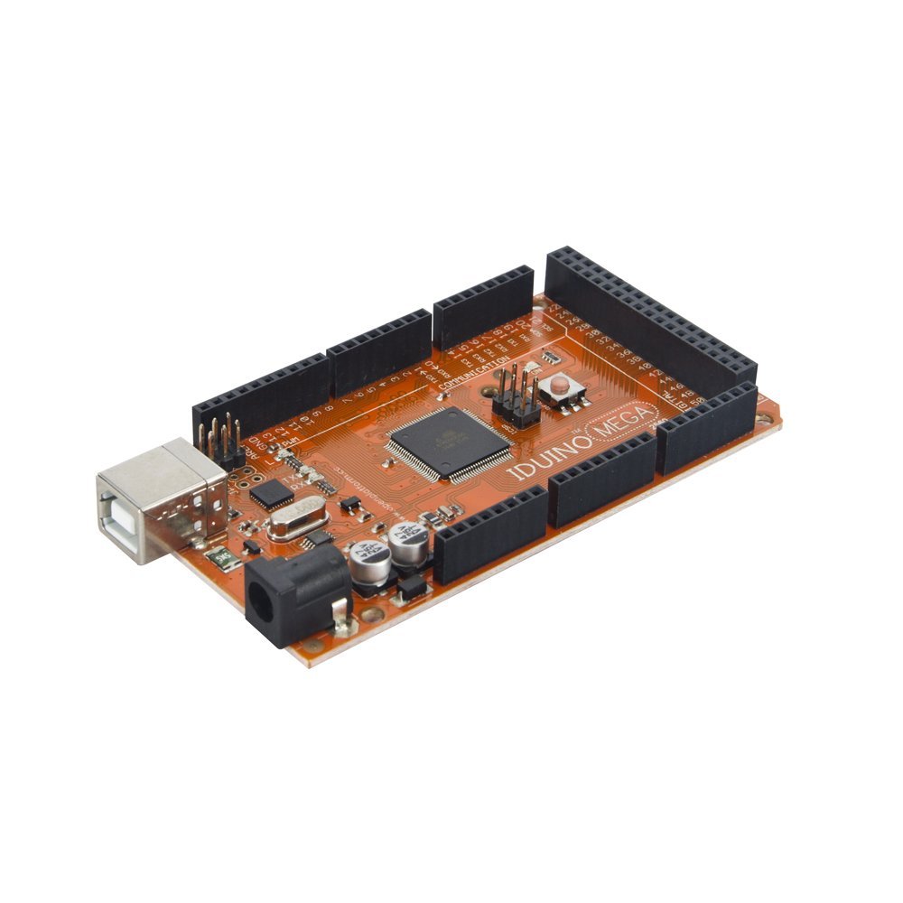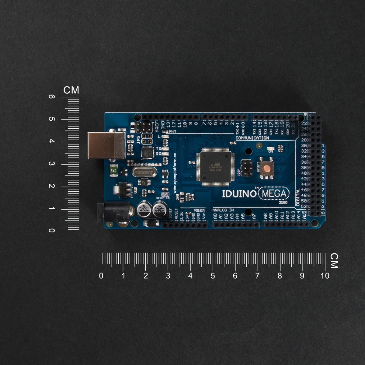 The Arduino Mega 2560 is a microcontroller board based on the ATmega2560. It has 54 digital input/output pins (of which 15 can be used as PWM outputs), 16 analog inputs, 4 UARTs (hardware serial ports), a 16 MHz crystal oscillator, a USB connection, a power jack, an ICSP header, and a reset button. It contains everything needed to support the microcontroller; simply connect it to a computer with a USB cable or power it with a AC-to-DC adapter or battery to get started. The Mega 2560 board is compatible with most shields designed for the Uno and the former boards Duemilanove or Diecimila.