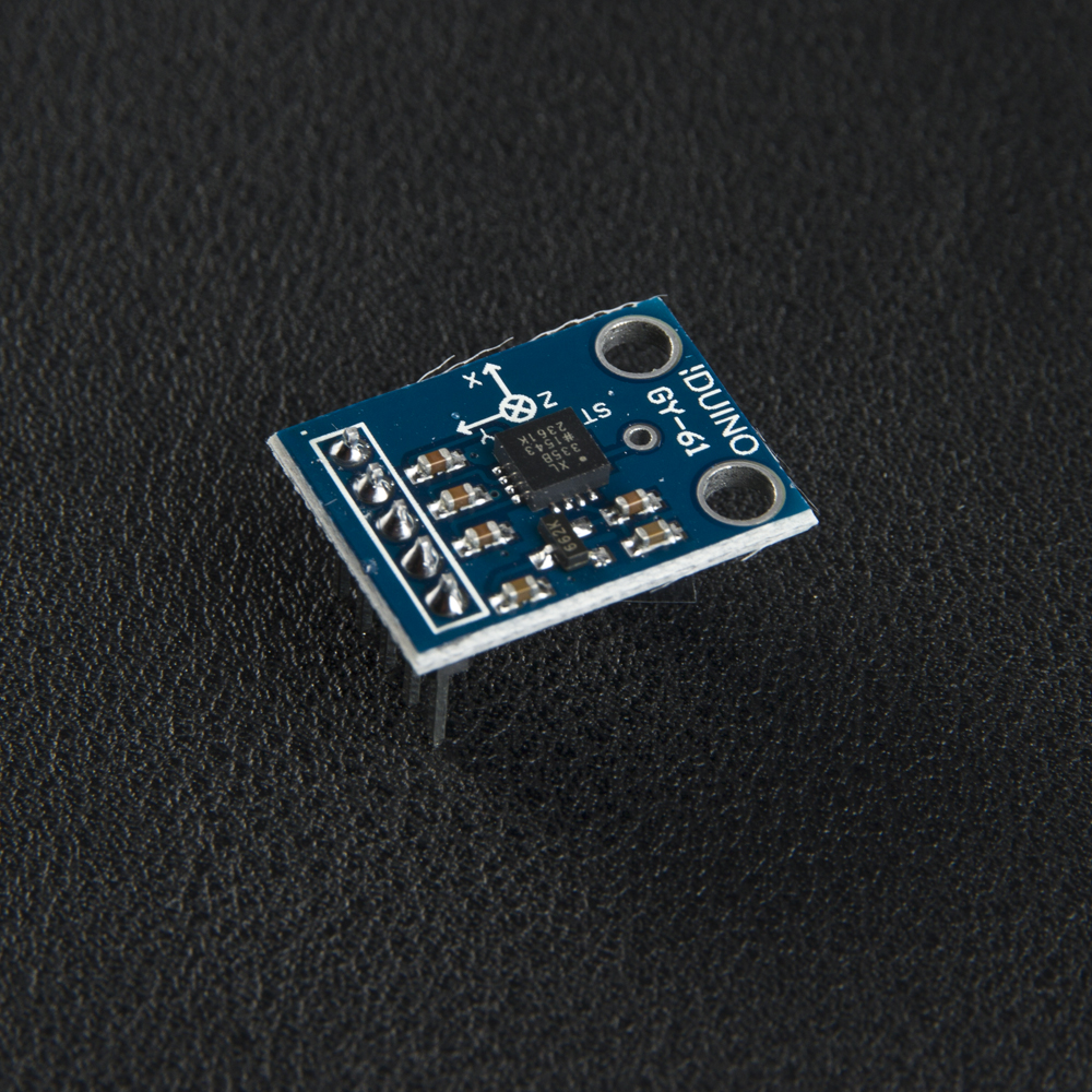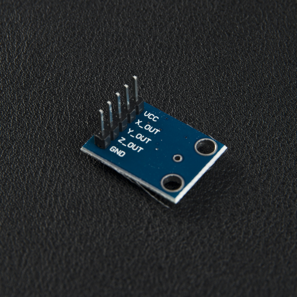 This module comes with 3 analog outputs for X, Y and Z axis measurements on a 0.75"x0.75" breakout board. The ADXL335 is the latest and greatest from Analog Devices, known for their exceptional quality MEMS devices. The VCC takes up to 5V in and regulates it to 3.3V with an output pin. The analog ratiometric: that means hat 0g measurement output is always at half of the 3.3V output (1.65V),-3g is at 0v and 3g is at 3.3V with full scaling in between.