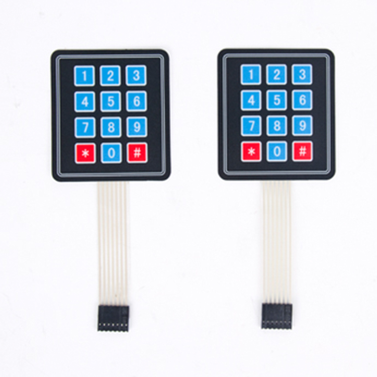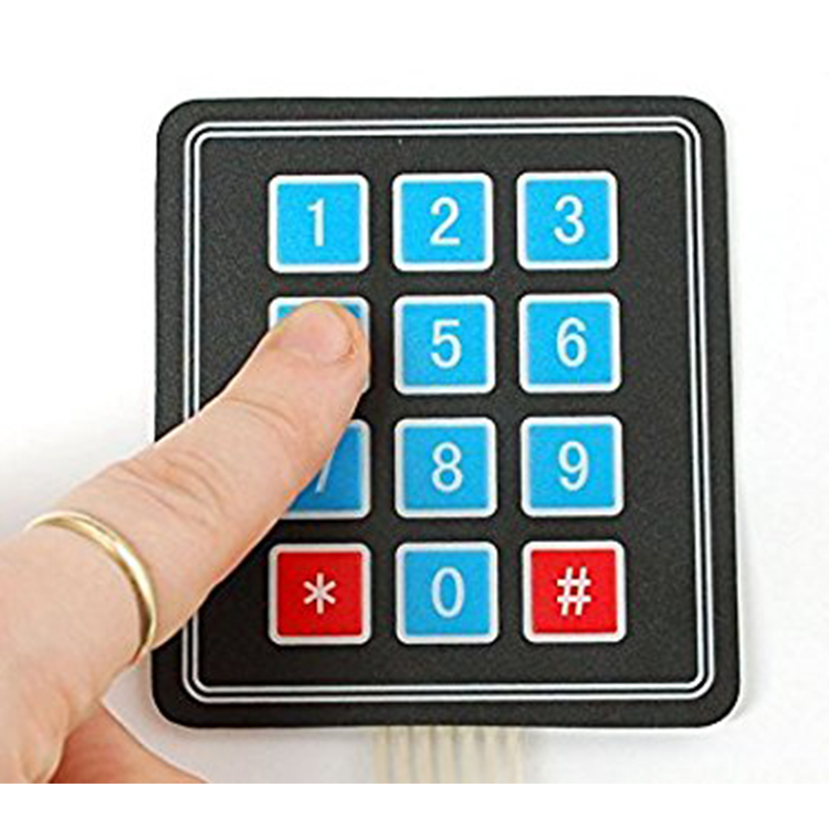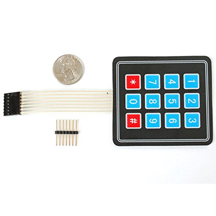This keypad has 12 buttons, arranged in a telephone-line 3x4 grid.It's made of a thin, flexible membrane material with an adhesive backing (just remove the paper) so you can attach it to nearly anything. The keys are connected into a matrix, so you only need 7 microcontroller pins (3-columns and 4-rows) to scan through the pad.