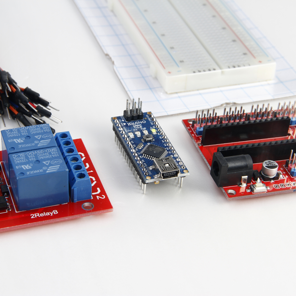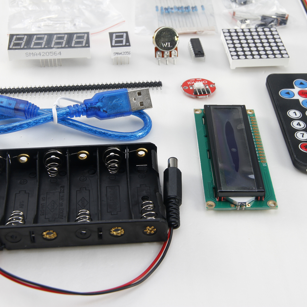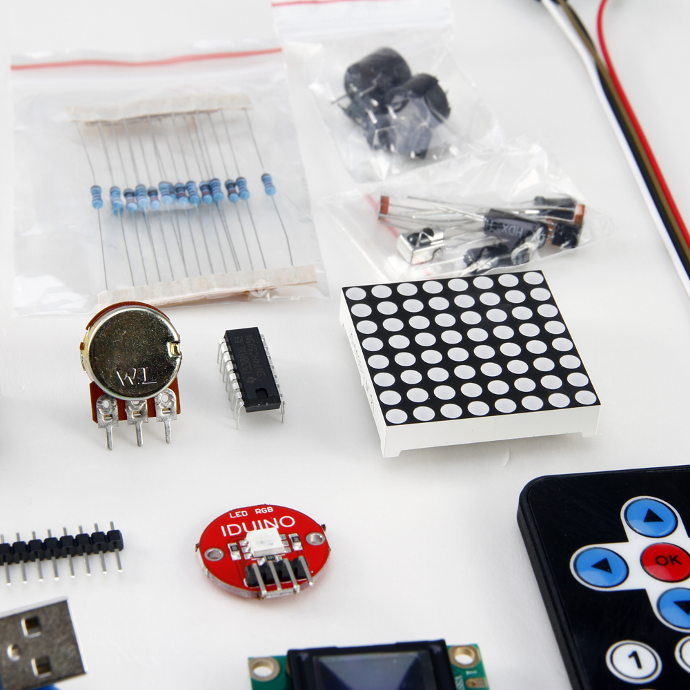 1 x 830-hole Bread board; 1 x NANO Extension Board; 1 x iduino NANO; 1 x 1602 LCD; 1 x 40-pin header ; 1 x USB cable (53cm);1 x 4-digit seven-segment display; 1 x 1-digit seven-segment display; 1 x 8 x 8 dot matrix; 1 x Active buzzer; 1 x Passive Buzzer;1 x Mini remote controller (built-in 1 x CR2025 button cell); 1 x 3-color RGB module; 1 x 2-Channel 5V relay; 1 x 6xAA battery box (cable-16cm); 1 x 74H595 IC; 4 x Female to Female DuPont cables (21cm); 30 x Colorful breadboard cables; 1 x LEDs Package; 5 x 1Kohm Resistors; 5 x 10Kohm Resistors; 8 x 220R Resistors; 4 x Key switches; 1 x Infrared receiver; 1 x LM35 sensor; 3 x Photoresistor; 2 x Ball switches; 1 x Flame sensor; 1 x 50K Potentiometer Adjustable Resistors1;